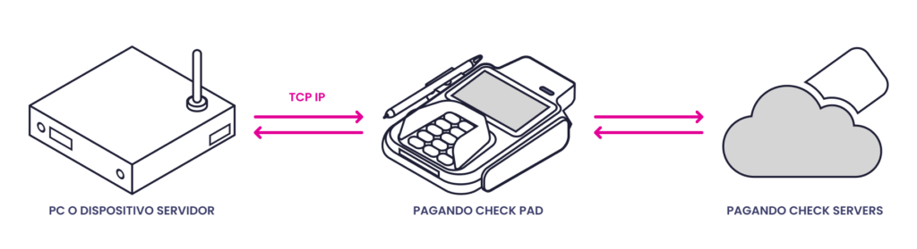Para la integración de la Pagando Check Pad² se realizó una comunicación por medio de un protocolo TCP/IP. Eso permitiendo conectar a la terminal cualquier dispositivo que este conectado por medio de Ethernet.